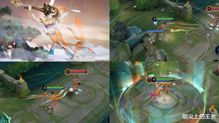 补天的优秀之处在于技能特效做的用心,以女娲炼五色石补天的故事为创意来源,将五色石元素融入技能设计中。大招为一道五色石弹道,五色石经过的地面,留下了关于传说中女娲的事迹画卷,包括捏泥造人、炼石补天等经典的故事。
